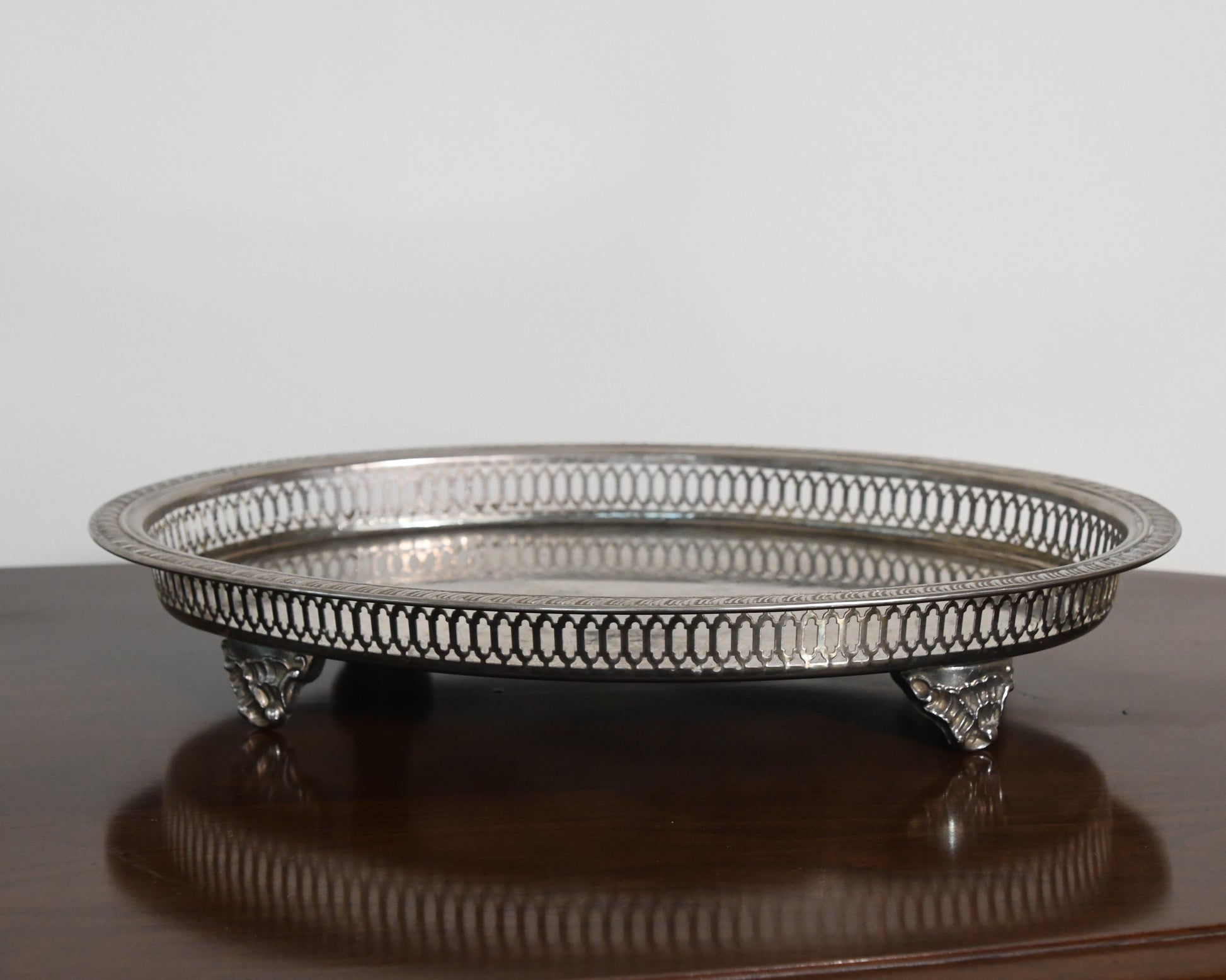 This vintage silver-plated serving tray features an oval shape, pierced gallery edge, and ornate claw-style feet, this piece exudes classic elegance and fine craftsmanship. Perfect for serving drinks or desserts, displaying candles or decanters, or as a decorative vanity or coffee table centerpiece.
