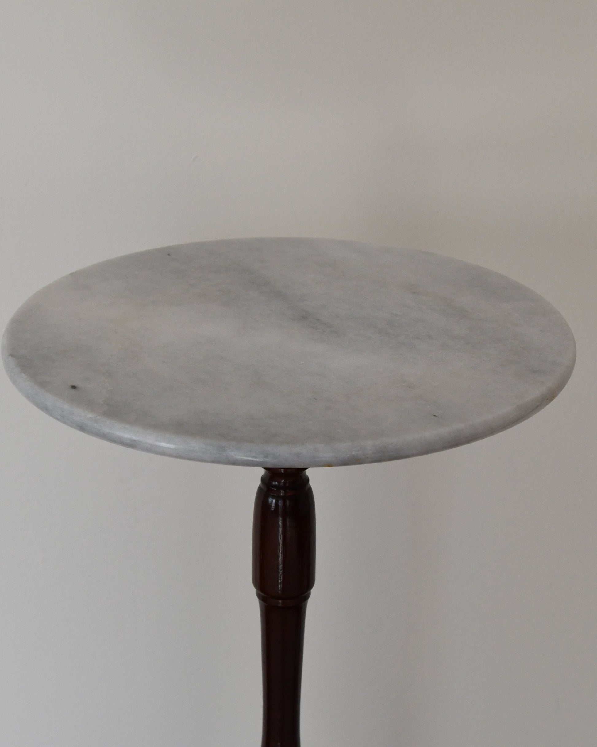 Featuring a solid white marble round top with soft natural veining, this vintage plant stand offers a touch of refined luxury. It rests on a turned solid wood pedestal base, beautifully carved with traditional detailing and finished in a rich, dark mahogany tone.