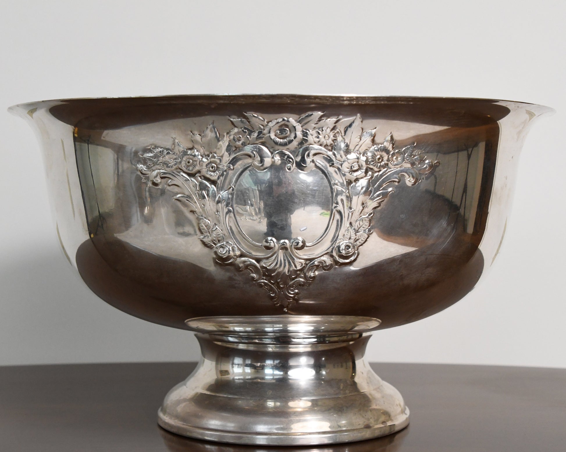 This elegant vintage punch bowl showcases timeless craftsmanship and detailed artistry, perfect for entertaining or as a decorative centerpiece. Crafted from silver-plated metal, the bowl features a highly polished finish with a raised floral and scroll motif surrounding an empty cartouche — ideal for monogramming or engraving.