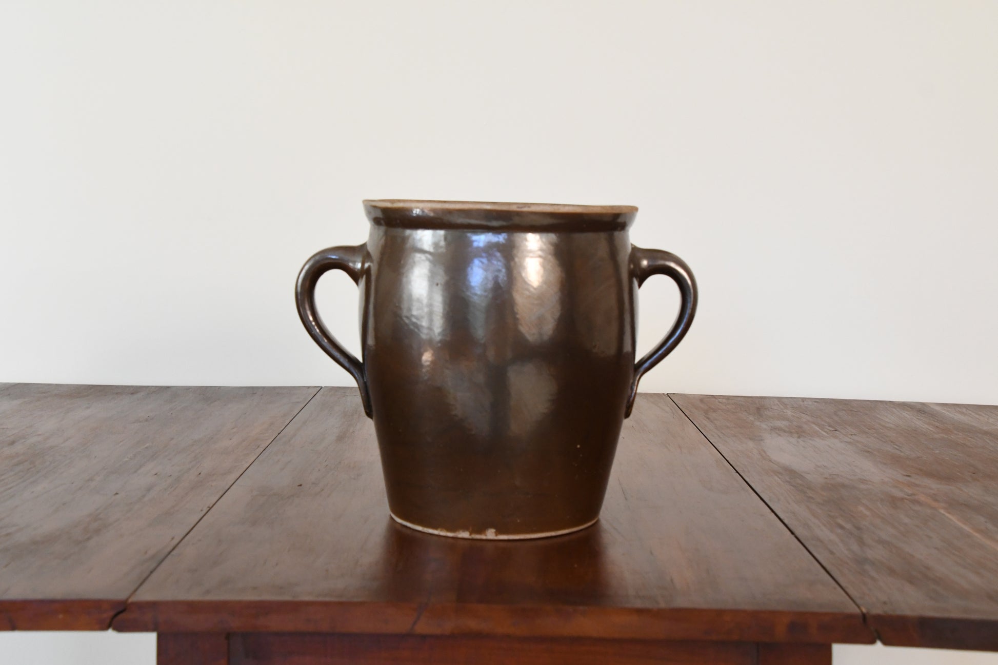 This handcrafted brown ceramic jar, dated 1979 features a double-handle design and a rich earthy glaze that captures the warmth of vintage pottery.